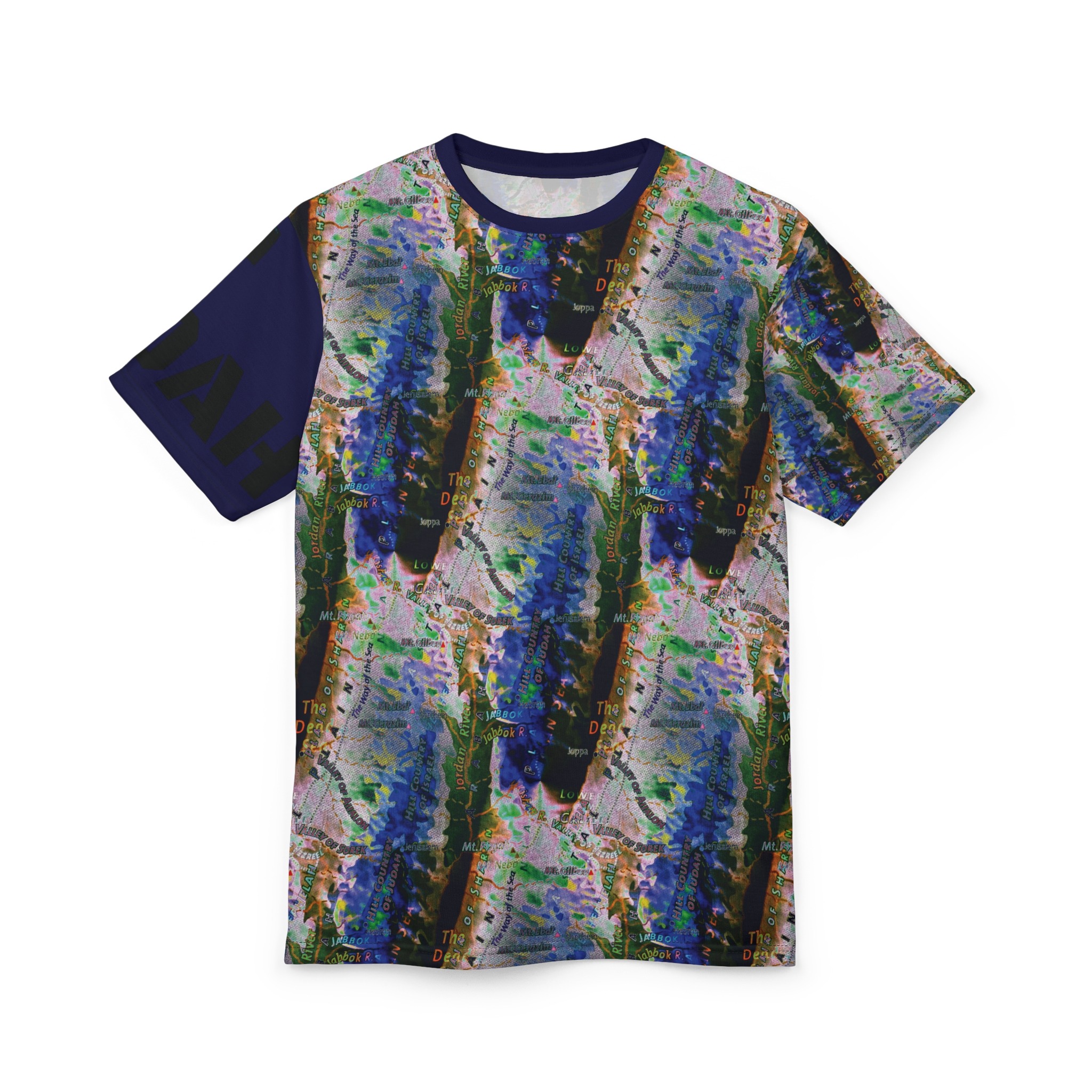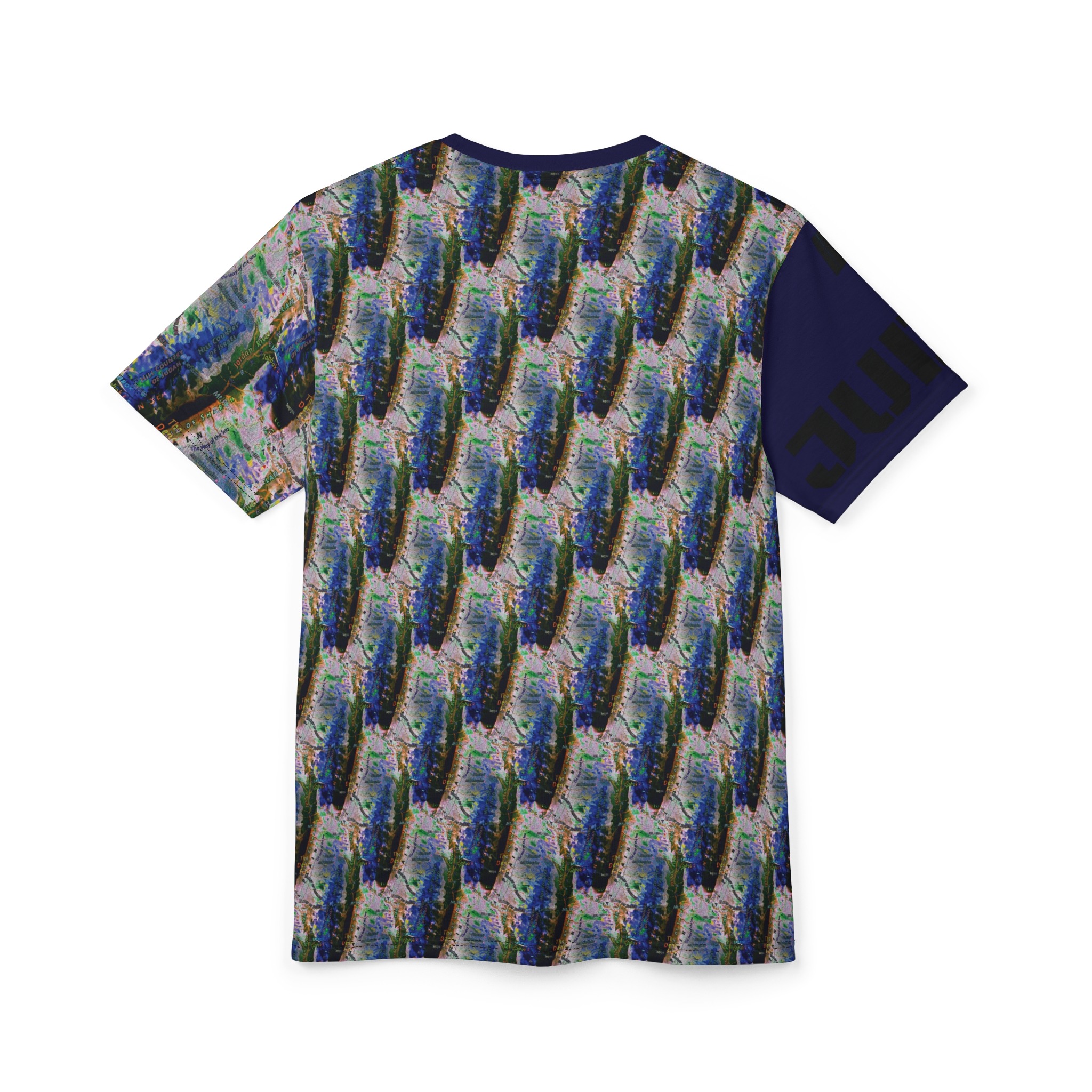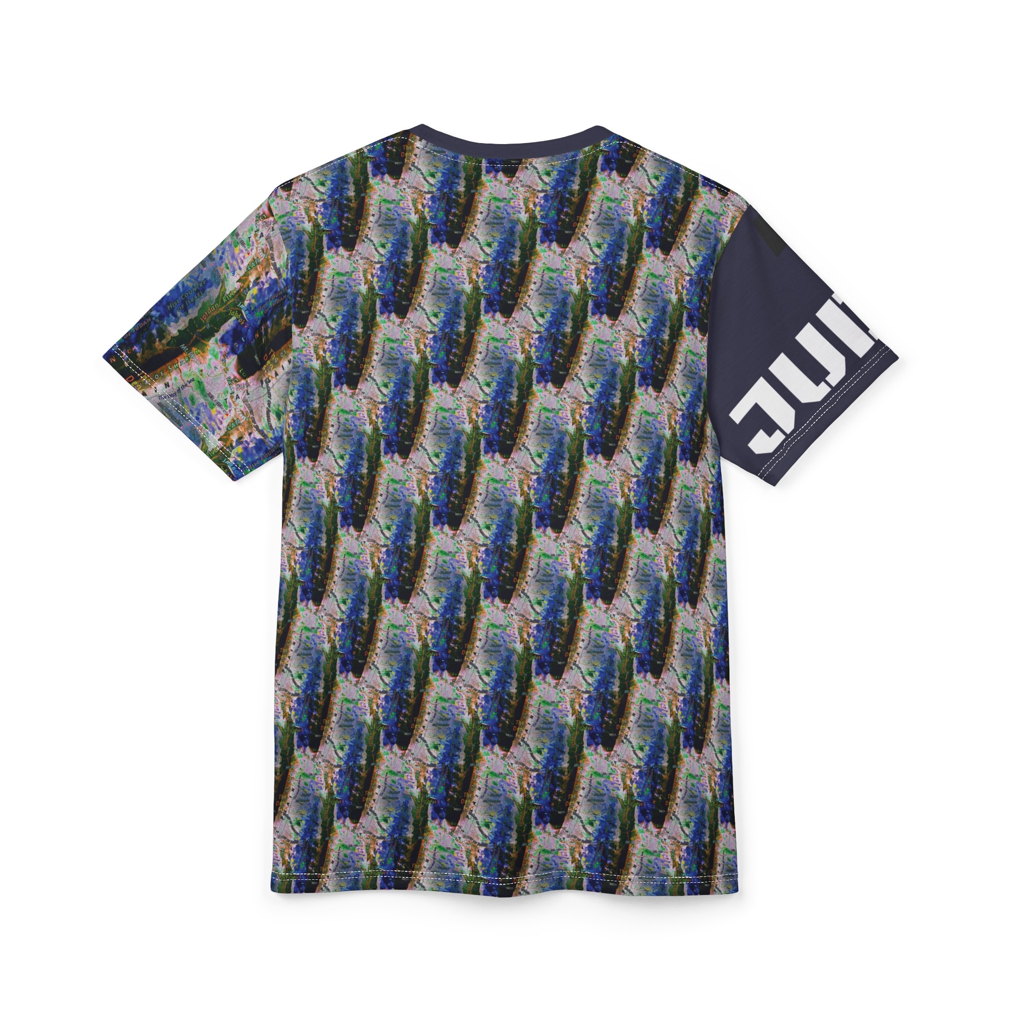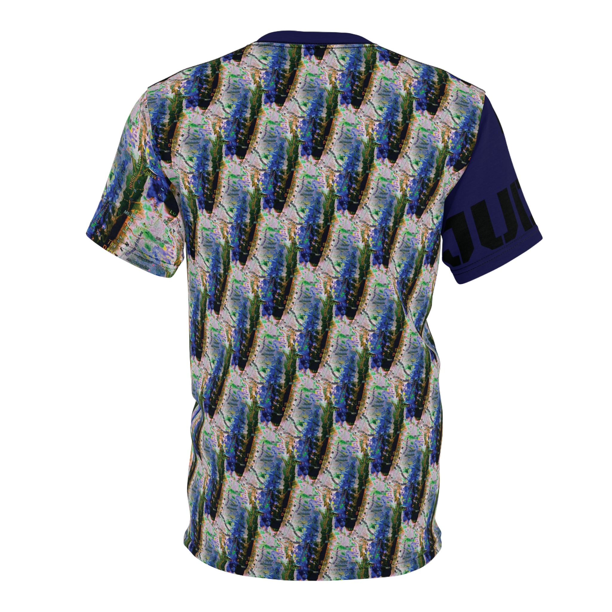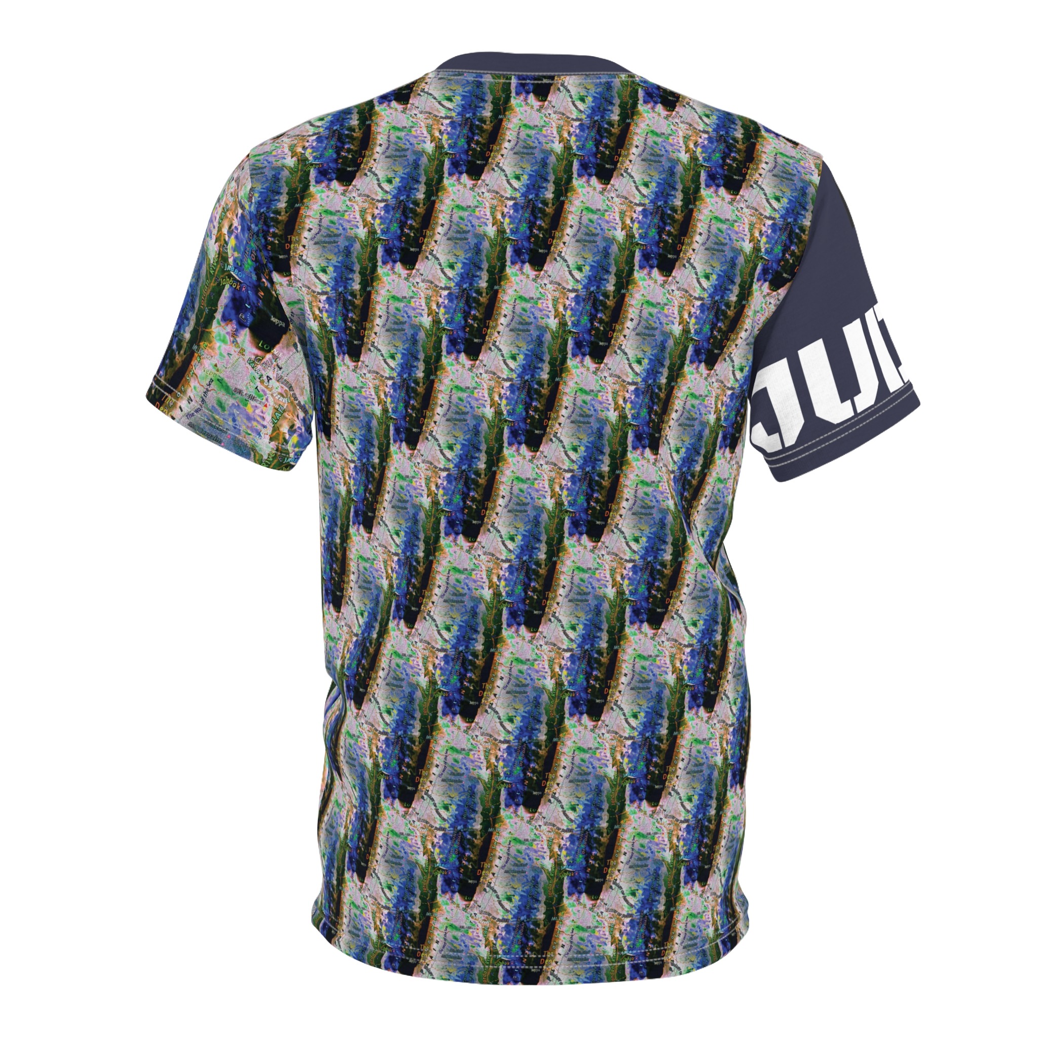 This all-over printed tee wraps you in an energetic, painterly collage — bold strokes of cobalt, green and warm neutrals flow across the body while a contrasting solid sleeve and collar add graphic punch. Lightweight yet durable polyester holds the vivid print and dries quickly, so the colors stay bright through wear and washes. Wear it when you want to stand out at an outdoor show, a gallery crawl, or neighborhood meet-up; it reads like wearable art that moves with you. The regular fit and tagless design keep comfort simple, while the side seams and shoulder tape give structure so the shirt keeps its shape over time. If you live for color, texture, and a bit of urban edge, this tee slides easily into your rotation — expressive, practical, and unapologetically visual.