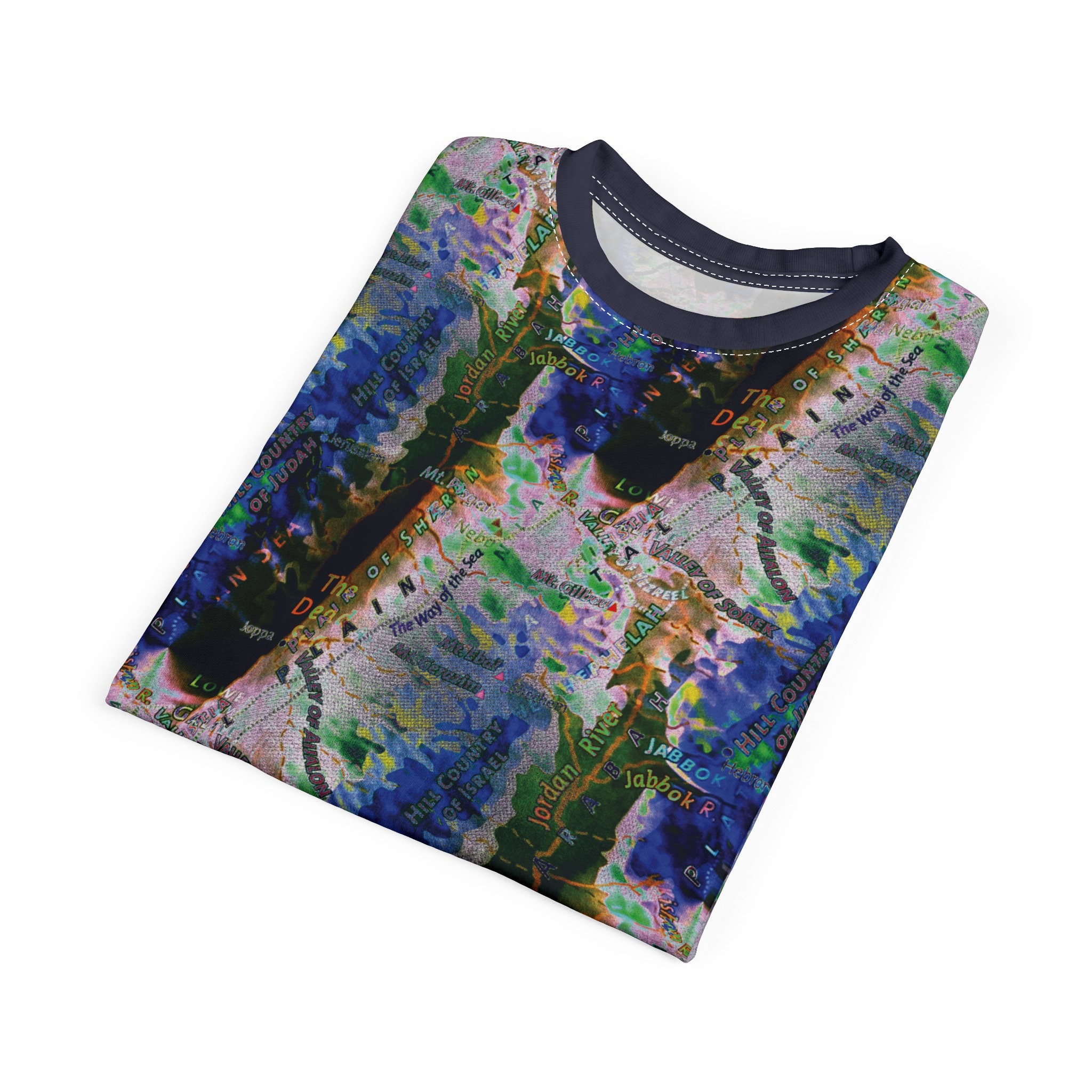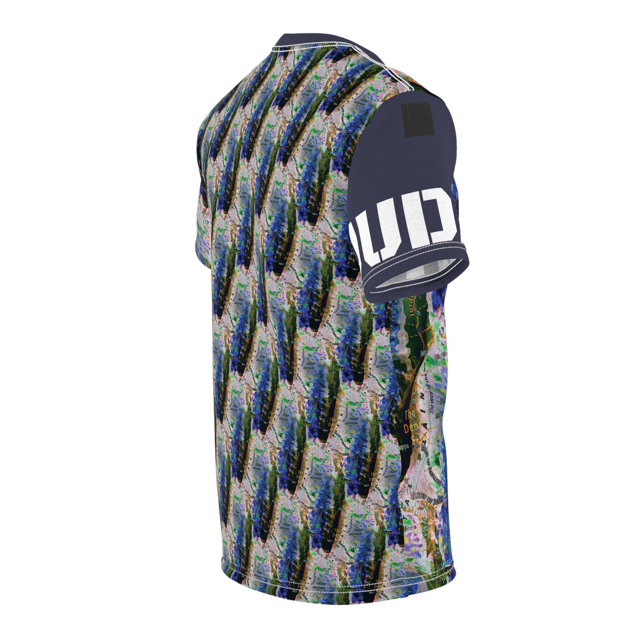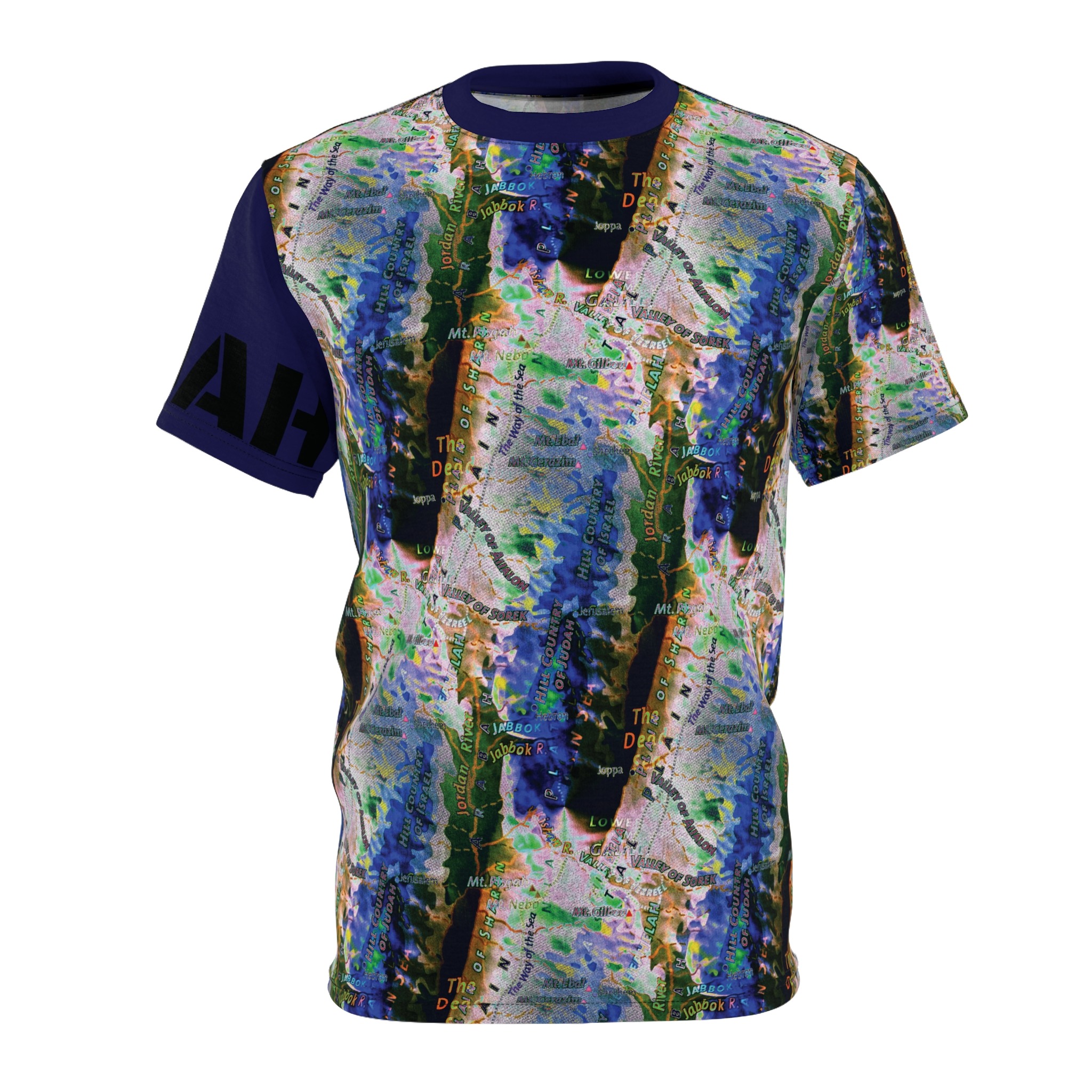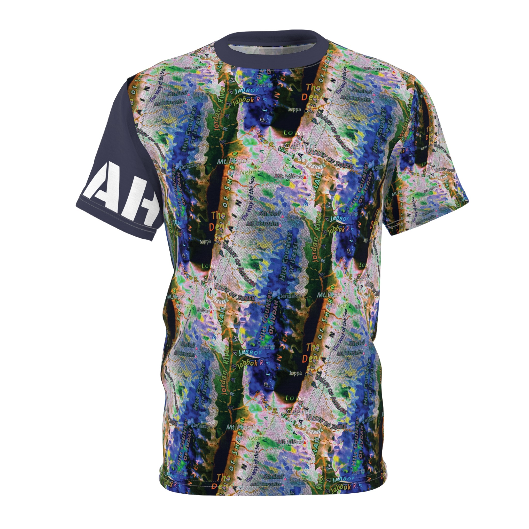 This all-over printed tee wraps you in an energetic, painterly collage — bold strokes of cobalt, green and warm neutrals flow across the body while a contrasting solid sleeve and collar add graphic punch. Lightweight yet durable polyester holds the vivid print and dries quickly, so the colors stay bright through wear and washes. Wear it when you want to stand out at an outdoor show, a gallery crawl, or neighborhood meet-up; it reads like wearable art that moves with you. The regular fit and tagless design keep comfort simple, while the side seams and shoulder tape give structure so the shirt keeps its shape over time. If you live for color, texture, and a bit of urban edge, this tee slides easily into your rotation — expressive, practical, and unapologetically visual.