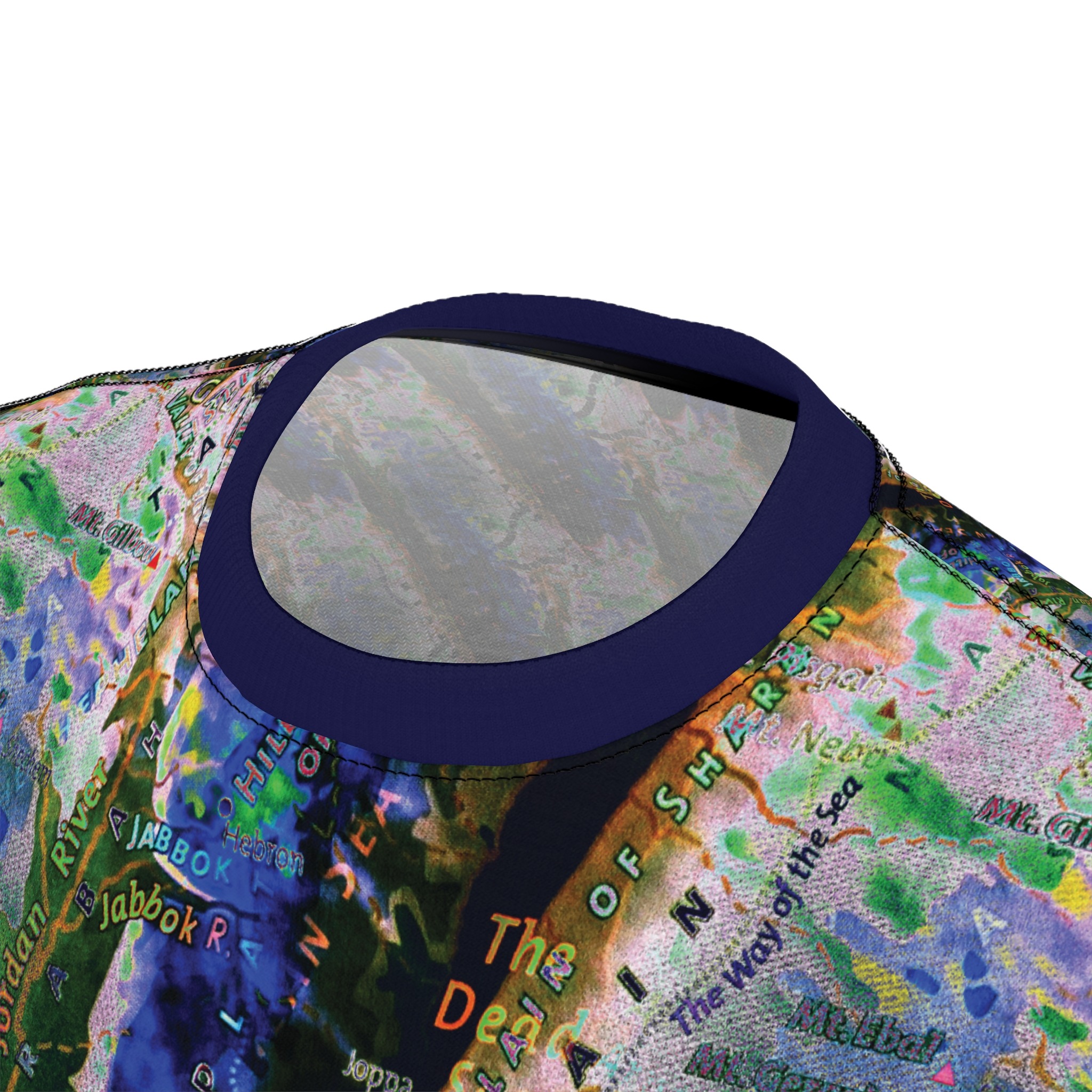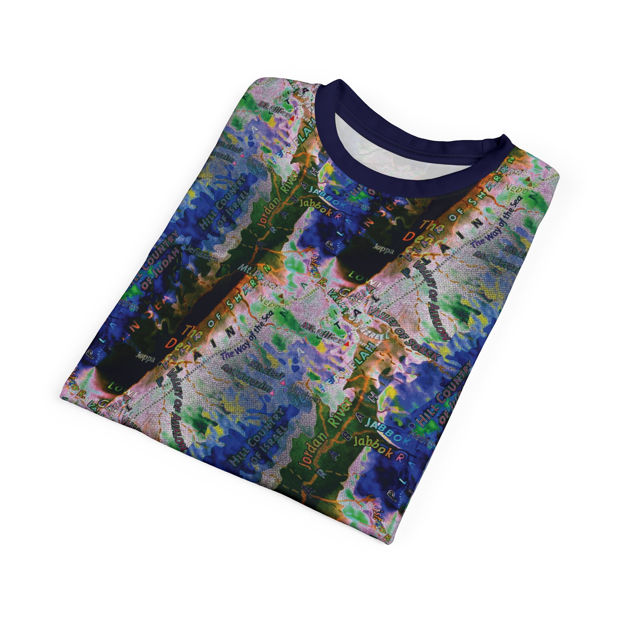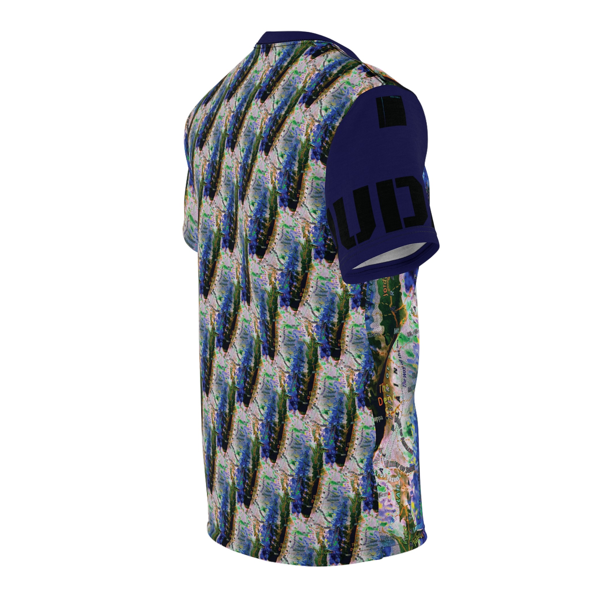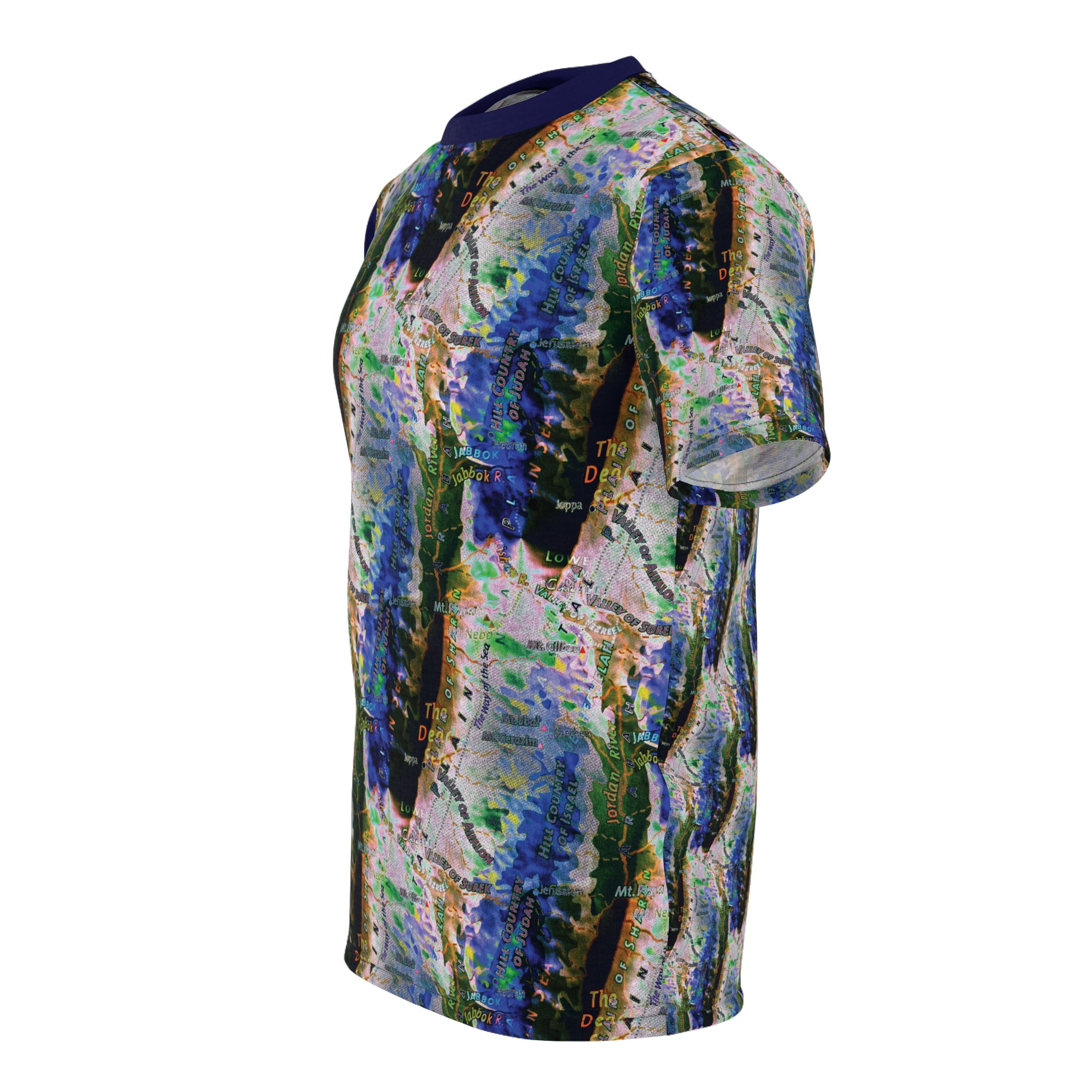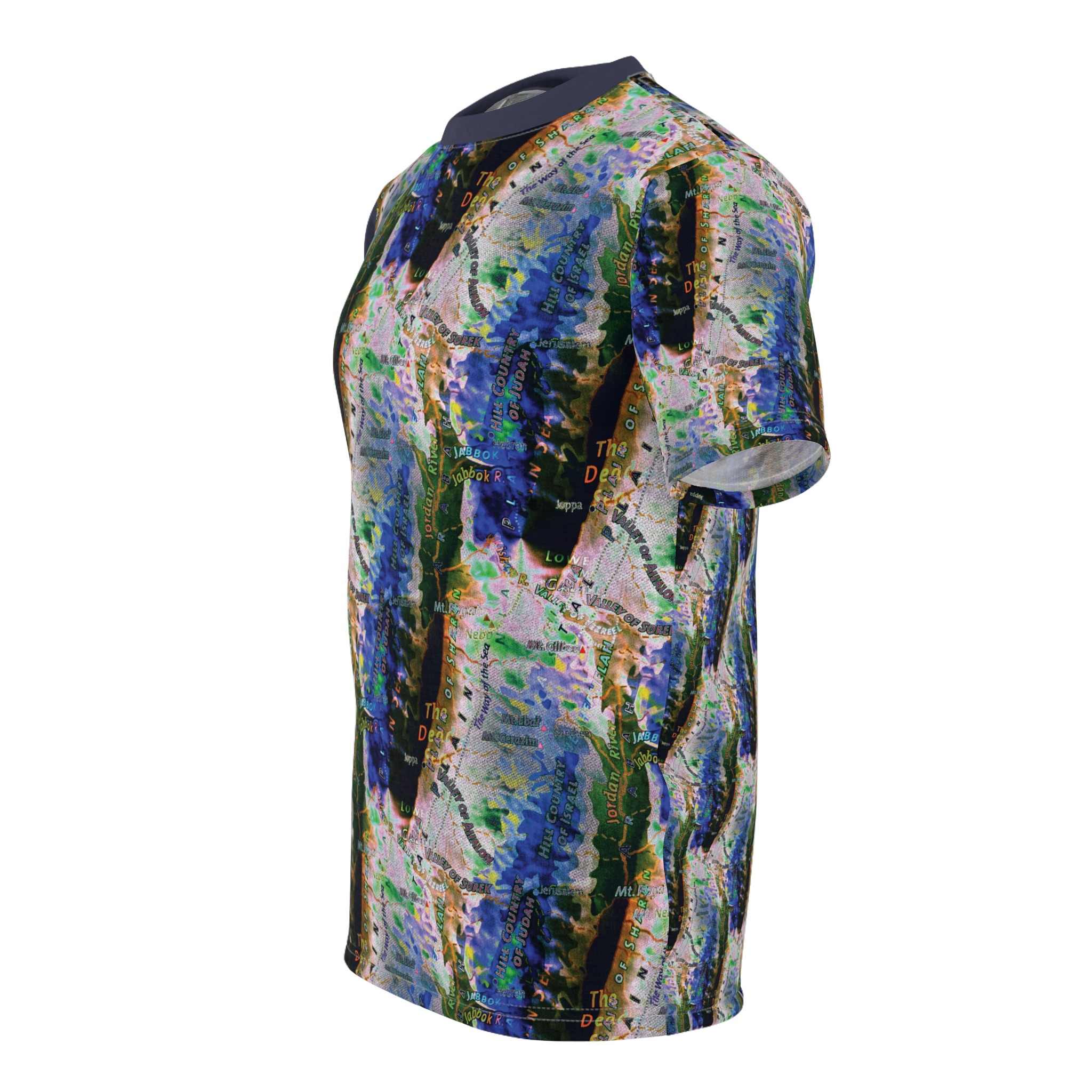 This all-over printed tee wraps you in an energetic, painterly collage — bold strokes of cobalt, green and warm neutrals flow across the body while a contrasting solid sleeve and collar add graphic punch. Lightweight yet durable polyester holds the vivid print and dries quickly, so the colors stay bright through wear and washes. Wear it when you want to stand out at an outdoor show, a gallery crawl, or neighborhood meet-up; it reads like wearable art that moves with you. The regular fit and tagless design keep comfort simple, while the side seams and shoulder tape give structure so the shirt keeps its shape over time. If you live for color, texture, and a bit of urban edge, this tee slides easily into your rotation — expressive, practical, and unapologetically visual.