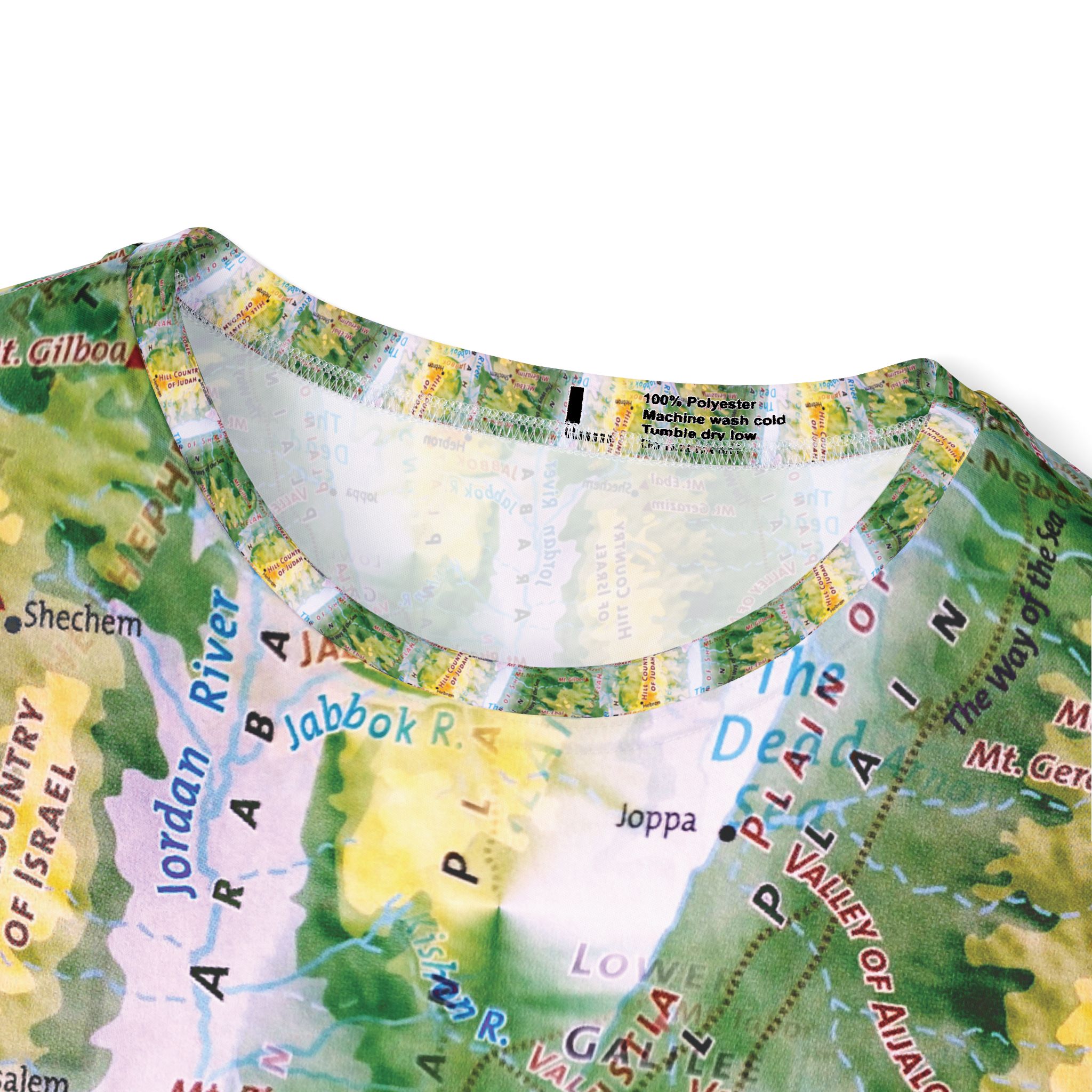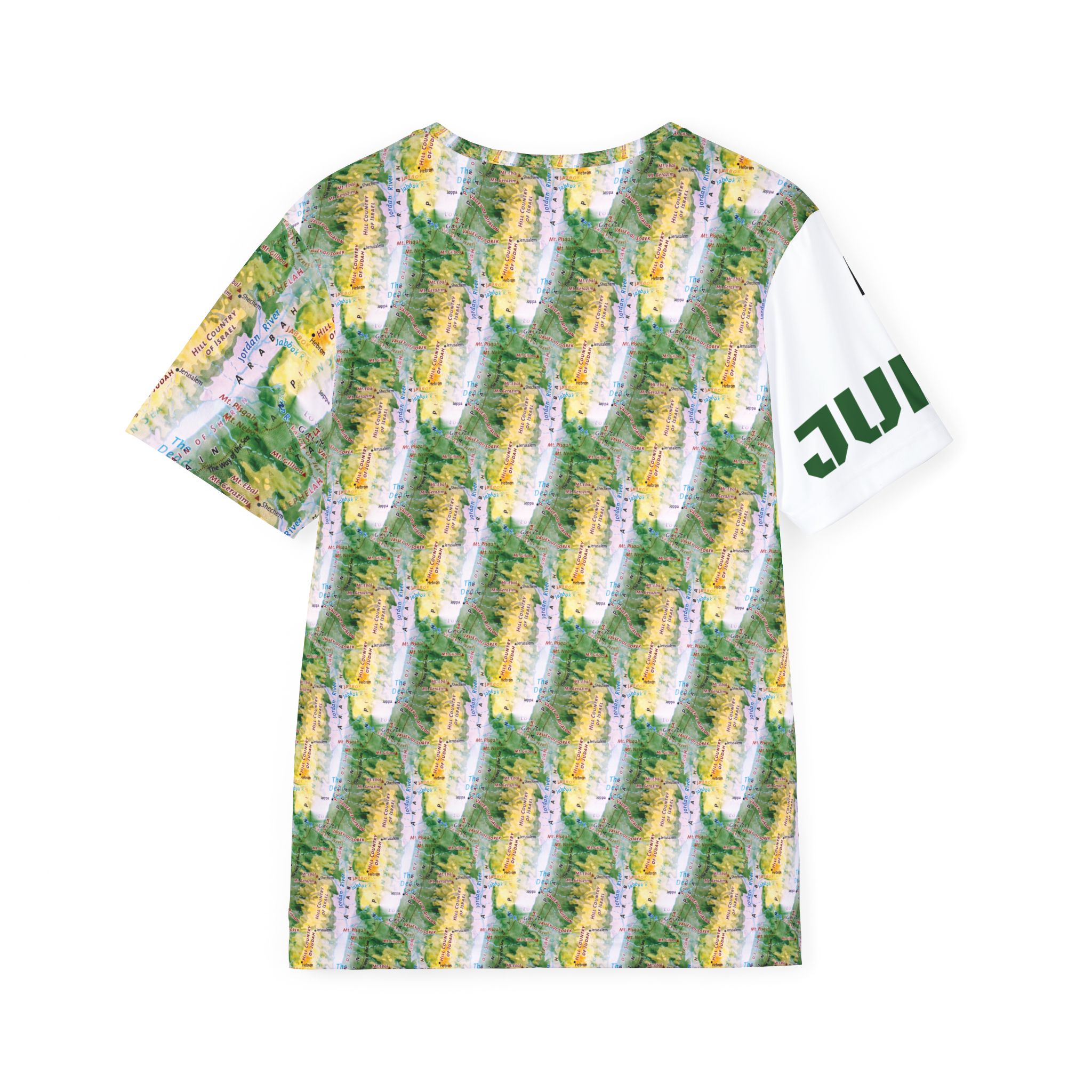 Light, loud, and built to move — this all-over print sports jersey brings a burst of map-like color to active days. The lightweight polyester fabric breathes and wicks so you stay cool during runs, practices, or long summer rides. The 1×1 ribbed collar and armholes stretch on and return to shape, keeping the fit tidy through repeated wear. Vibrant dye-sublimated printing means the layered greens and sunny accents hold their depth wash after wash, while the classic cut offers comfortable coverage without bulk. Wear it to training, weekend adventures, or layered under a shell when the trail calls — it feels like motion the moment you put it on.