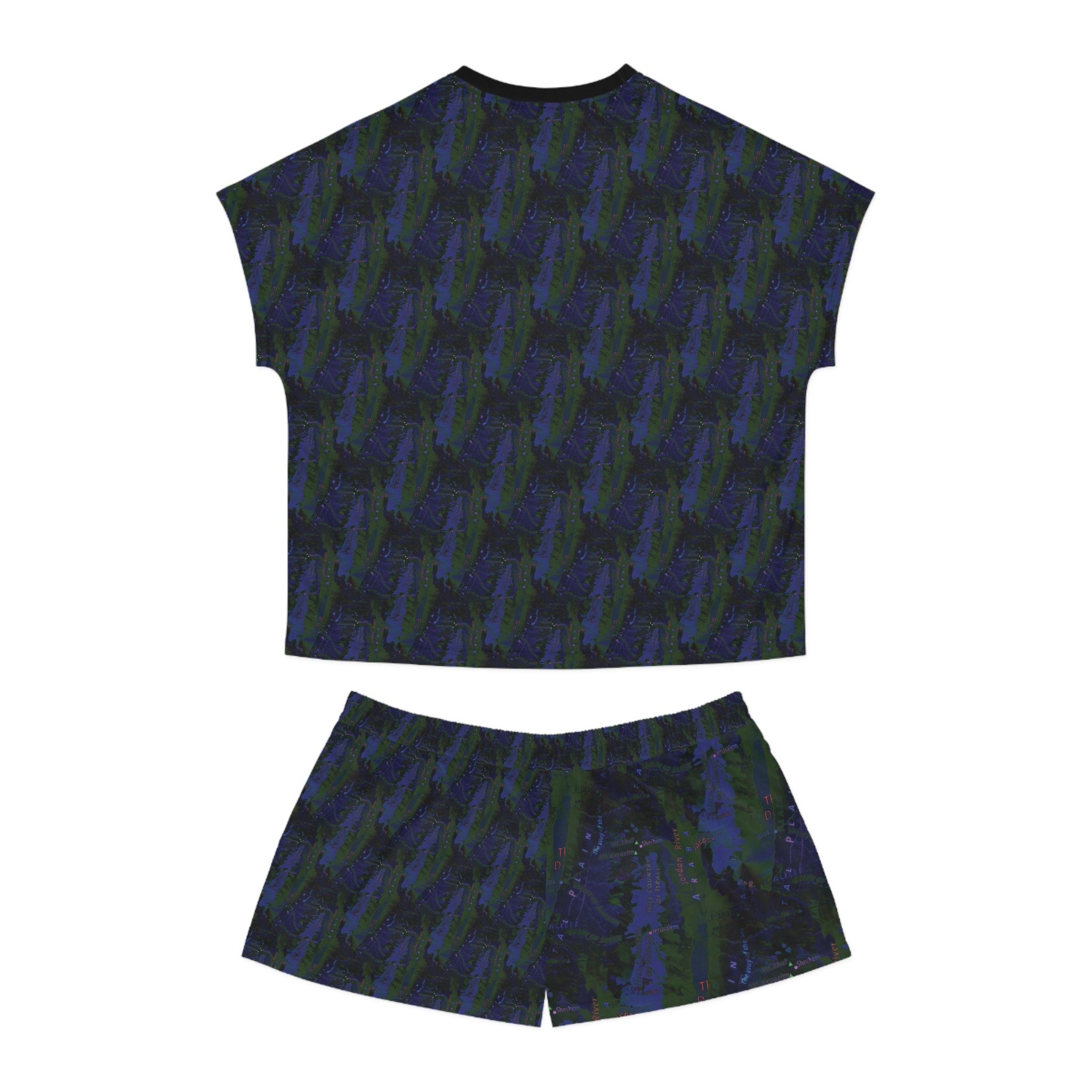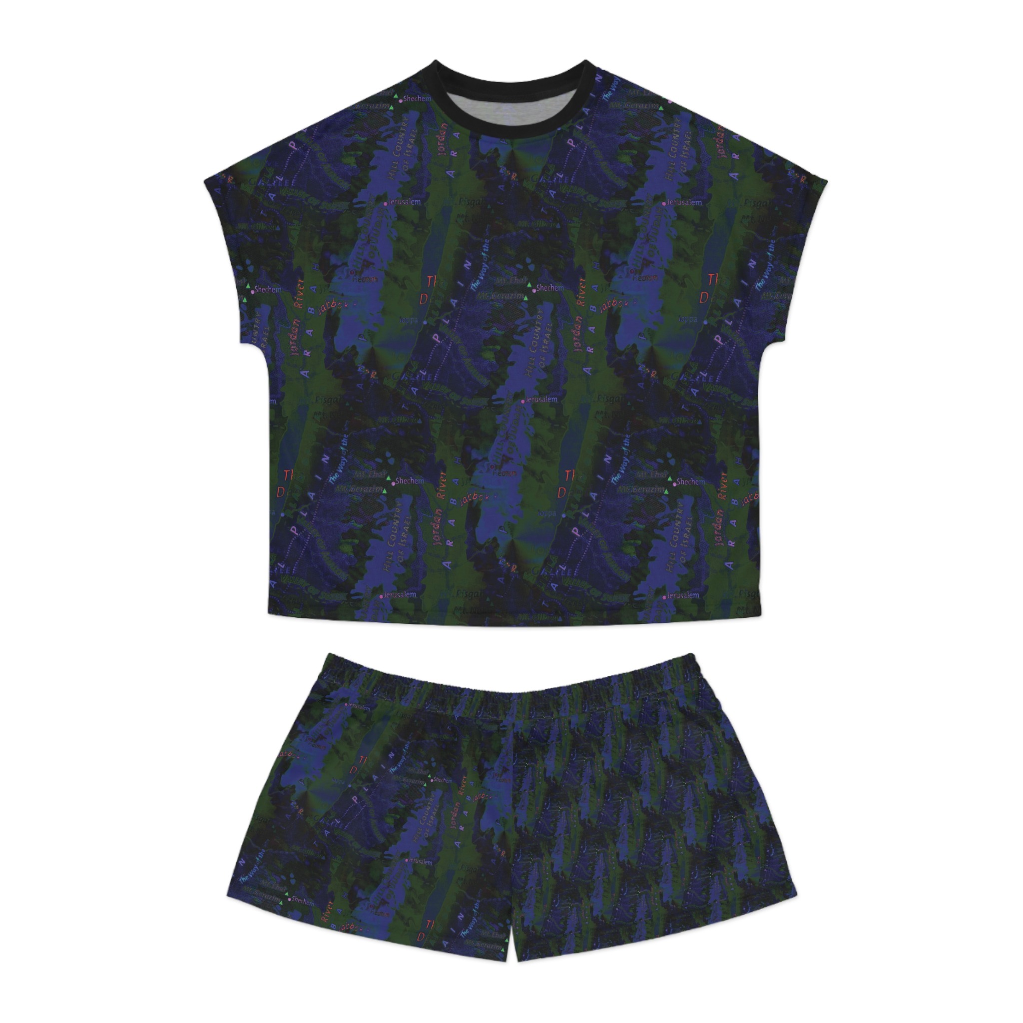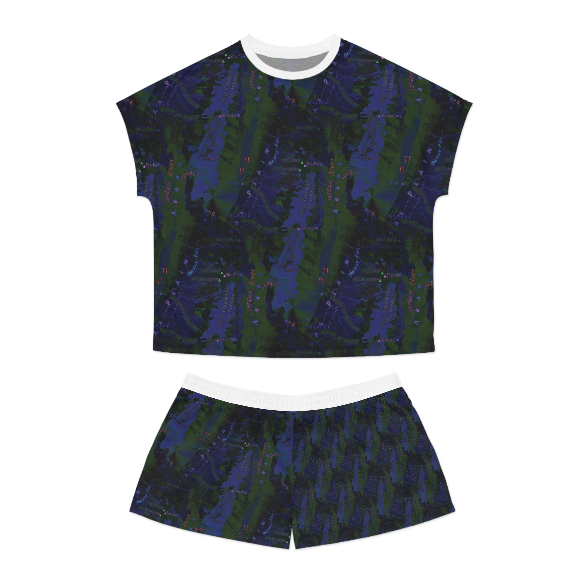 A short, airy pajama set that feels like slipping into a private night sky. The relaxed, boxy top and easy shorts move with you — breathing, stretching, curling up. Deep indigo and forest-green brushstrokes create a moody, painterly pattern that reads like a twilight forest or watercolor map when the light falls soft. Lightweight stretch fabric and a soft elastic waist make it comfortable for long evenings of reading, late-night conversations, or slow mornings with coffee. The ribbed collar keeps the silhouette tidy, while the no-sleeve-seam construction gives the top a roomy, modern drape. Wear it when you want to feel calm, contained, and quietly stylish at home.