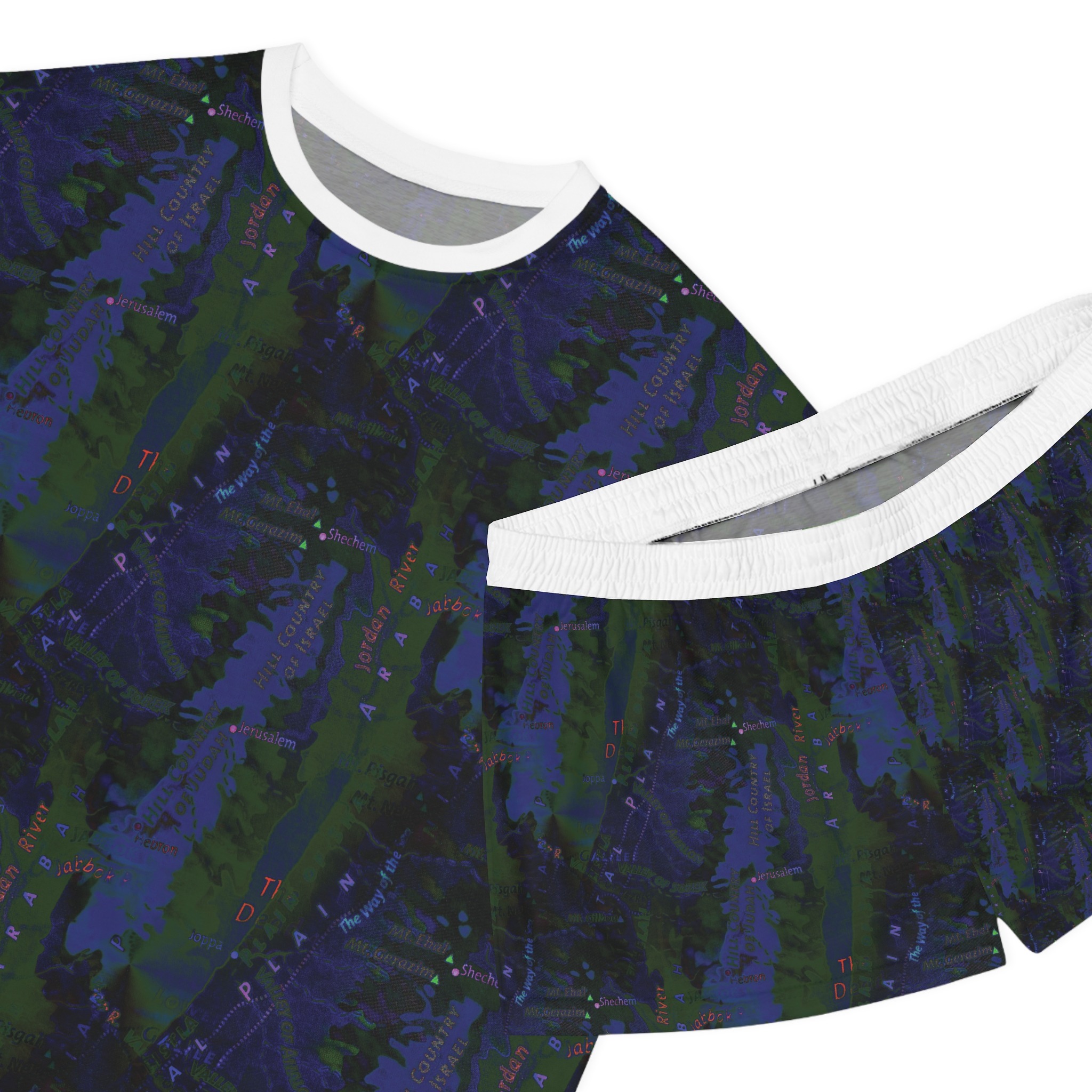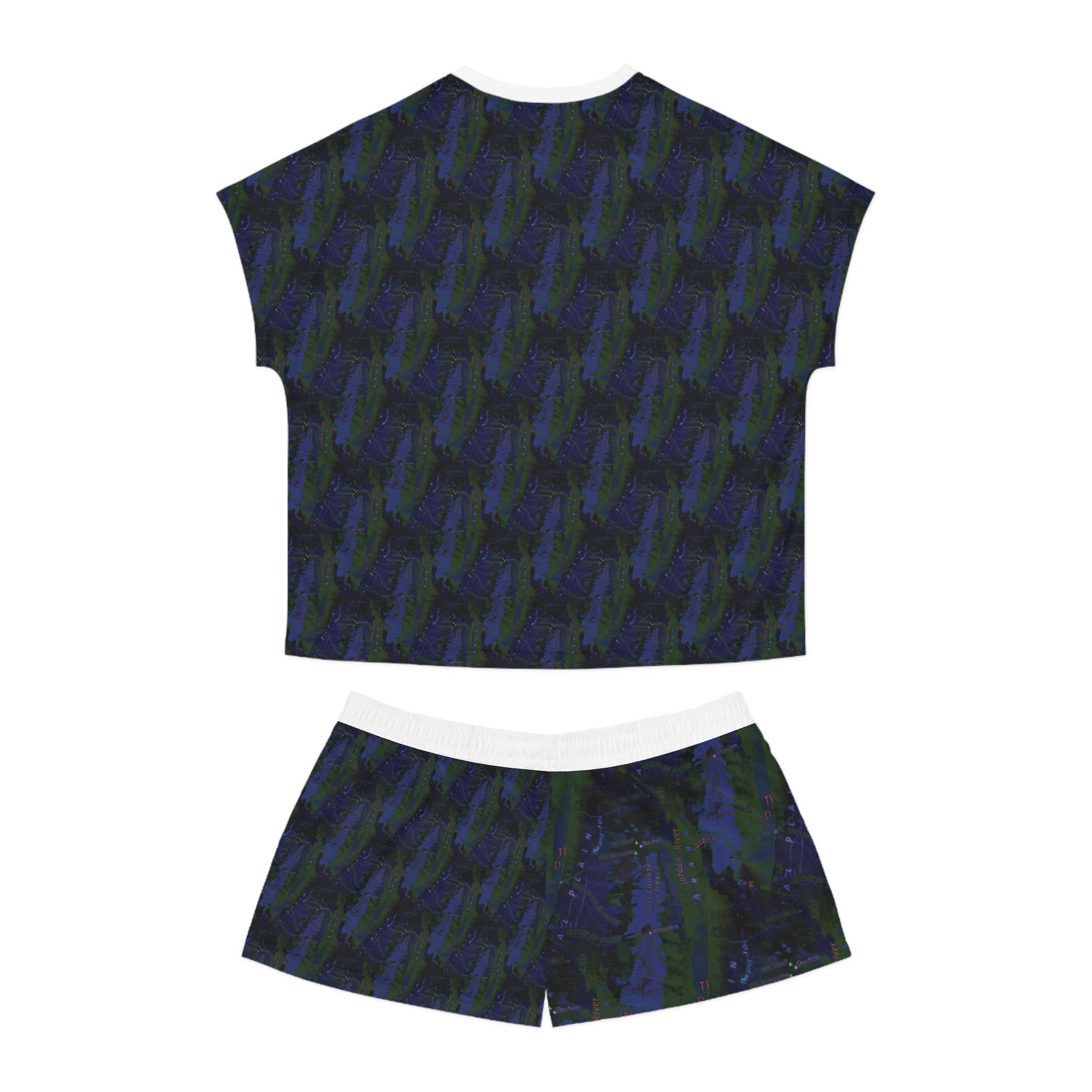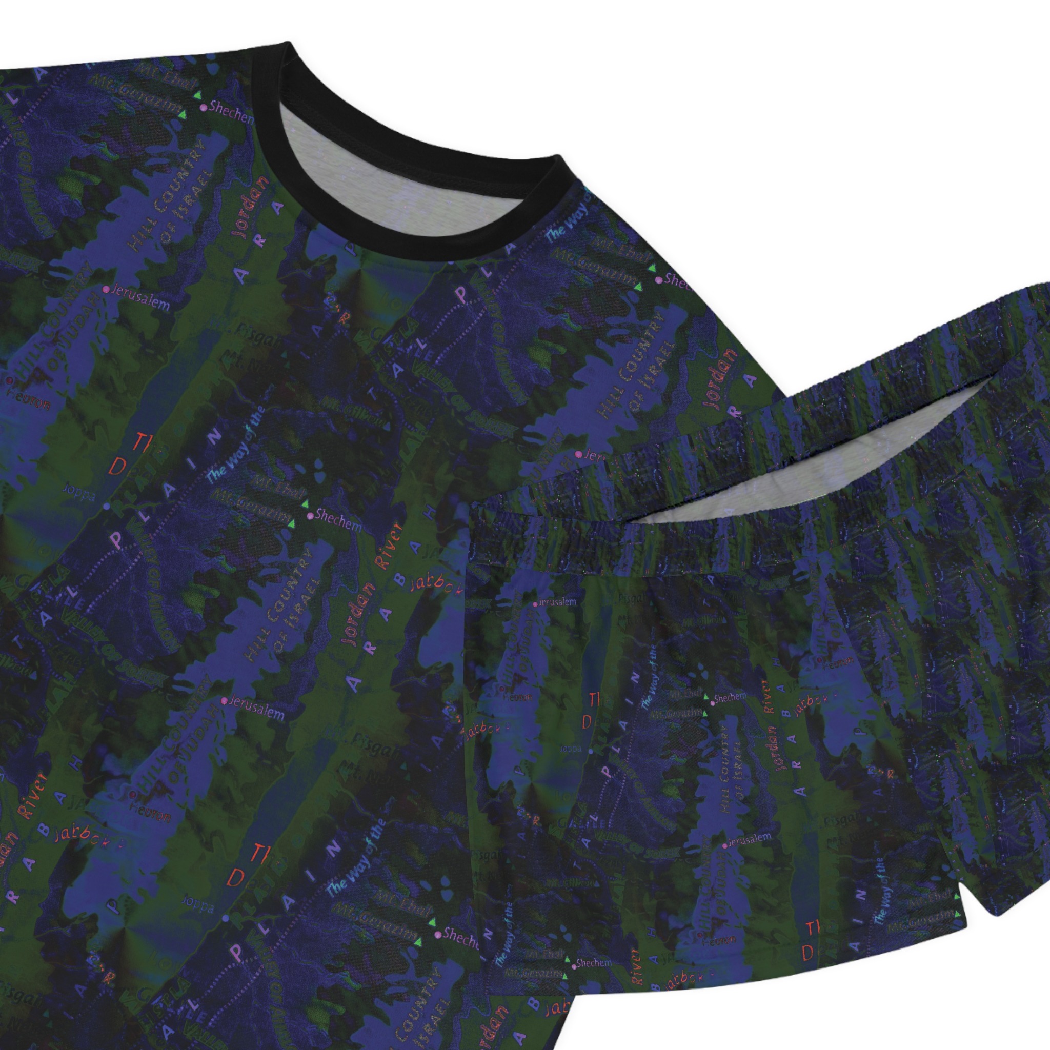 A short, airy pajama set that feels like slipping into a private night sky. The relaxed, boxy top and easy shorts move with you — breathing, stretching, curling up. Deep indigo and forest-green brushstrokes create a moody, painterly pattern that reads like a twilight forest or watercolor map when the light falls soft. Lightweight stretch fabric and a soft elastic waist make it comfortable for long evenings of reading, late-night conversations, or slow mornings with coffee. The ribbed collar keeps the silhouette tidy, while the no-sleeve-seam construction gives the top a roomy, modern drape. Wear it when you want to feel calm, contained, and quietly stylish at home.